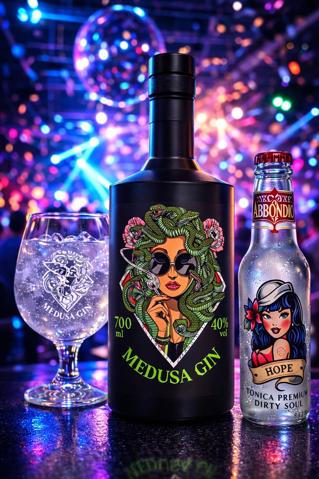 To prepare it, you only need a few ingredients: a few ice cubes, 50 ml of Medusa Gin, double the amount of tonic water, a tablespoon of fresh lime juice, and a lime wedge for garnish.